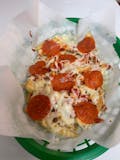 Fries topped with mozzarella cheese, pizza sauce, and pepperoni